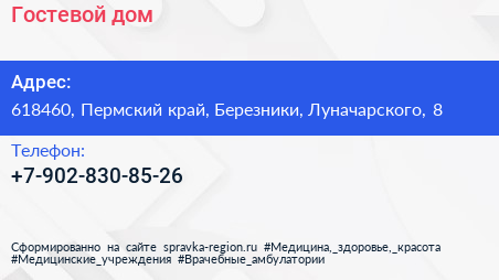 Гостевой дом по адресу 618460, Пермский край, Березники, Луначарского, 8 в дальнейшем Организация, размещена в следующих категориях: