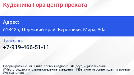 Кудыкина Гора, центр проката по адресу 618425, Пермский край, Березники, Мира, 90а в дальнейшем Организация, размещена в следующих категориях: