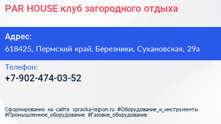 PAR HOUSE, клуб загородного отдыха по адресу 618425, Пермский край, Березники, Сухановская, 29а в дальнейшем Организация, размещена в следующих категориях: