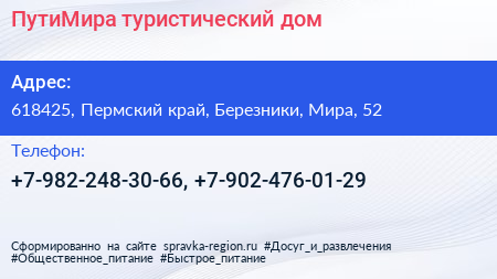 ПутиМира, туристический дом по адресу 618425, Пермский край, Березники, Мира, 52 в дальнейшем Организация, размещена в следующих категориях: