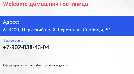 Welcome, домашняя гостиница по адресу 618400, Пермский край, Березники, Свободы, 51 в дальнейшем Организация, размещена в следующих категориях:
