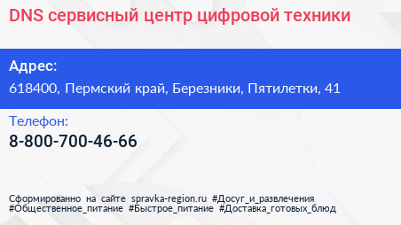 DNS, сервисный центр цифровой техники по адресу 618400, Пермский край, Березники, Пятилетки, 41 в дальнейшем Организация, размещена в следующих категориях: