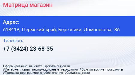 Матрица, магазин по адресу 618419, Пермский край, Березники, Ломоносова, 86 в дальнейшем Организация, размещена в следующих категориях: