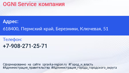 OGNI-Service, компания по адресу 618400, Пермский край, Березники, Ключевая, 51 в дальнейшем Организация, размещена в следующих категориях: