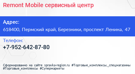 Remont Mobile, сервисный центр по адресу 618400, Пермский край, Березники, проспект Ленина, 47 в дальнейшем Организация, размещена в следующих категориях: