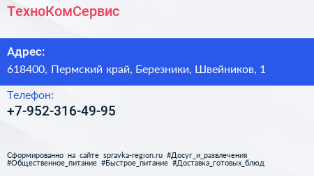 ТехноКомСервис по адресу 618400, Пермский край, Березники, Швейников, 1 в дальнейшем Организация, размещена в следующих категориях: