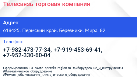 Телесвязь, торговая компания по адресу 618425, Пермский край, Березники, Мира, 82 в дальнейшем Организация, размещена в следующих категориях: