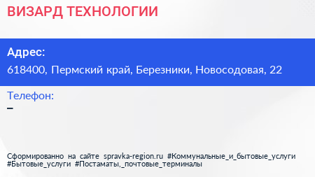 ВИЗАРД-ТЕХНОЛОГИИ по адресу 618400, Пермский край, Березники, Новосодовая, 22 в дальнейшем Организация, размещена в следующих категориях: