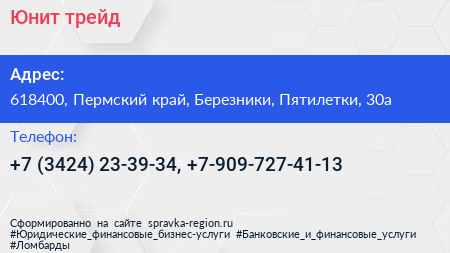 Юнит трейд по адресу 618400, Пермский край, Березники, Пятилетки, 30а в дальнейшем Организация, размещена в следующих категориях:
