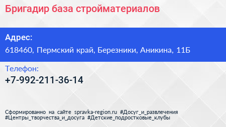 Бригадир, база стройматериалов по адресу 618460, Пермский край, Березники, Аникина, 11Б в дальнейшем Организация, размещена в следующих категориях: