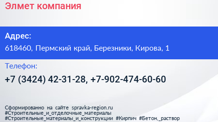 Элмет, компания по адресу 618460, Пермский край, Березники, Кирова, 1 в дальнейшем Организация, размещена в следующих категориях: