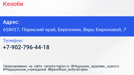 Кеноби по адресу 618417, Пермский край, Березники, Веры Бирюковой, 7 в дальнейшем Организация, размещена в следующих категориях: