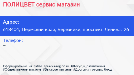 ПОЛИЦВЕТ сервис, магазин по адресу 618404, Пермский край, Березники, проспект Ленина, 26 в дальнейшем Организация, размещена в следующих категориях:
