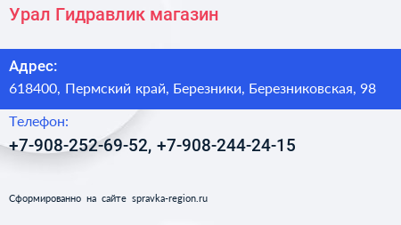 Урал Гидравлик, магазин по адресу 618400, Пермский край, Березники, Березниковская, 98 в дальнейшем Организация, размещена в следующих категориях: