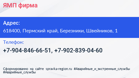 ЯМП, фирма по адресу 618400, Пермский край, Березники, Швейников, 1 в дальнейшем Организация, размещена в следующих категориях: