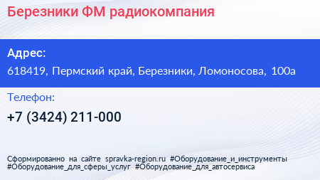 Березники ФМ, радиокомпания по адресу 618419, Пермский край, Березники, Ломоносова, 100а в дальнейшем Организация, размещена в следующих категориях: