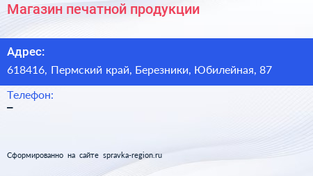 Магазин печатной продукции по адресу 618416, Пермский край, Березники, Юбилейная, 87 в дальнейшем Организация, размещена в следующих категориях: