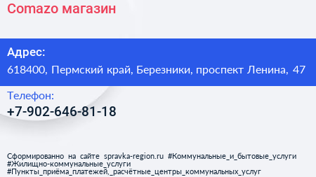 Comazo, магазин по адресу 618400, Пермский край, Березники, проспект Ленина, 47 в дальнейшем Организация, размещена в следующих категориях:
