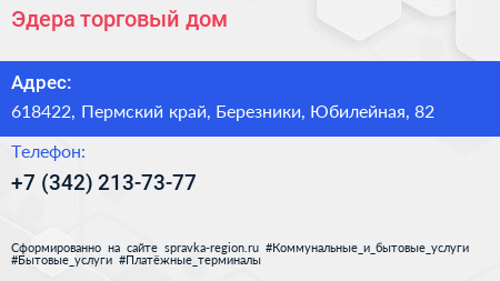 Эдера, торговый дом по адресу 618422, Пермский край, Березники, Юбилейная, 82 в дальнейшем Организация, размещена в следующих категориях: