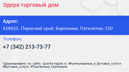 Эдера, торговый дом по адресу 618425, Пермский край, Березники, Пятилетки, 150 в дальнейшем Организация, размещена в следующих категориях: