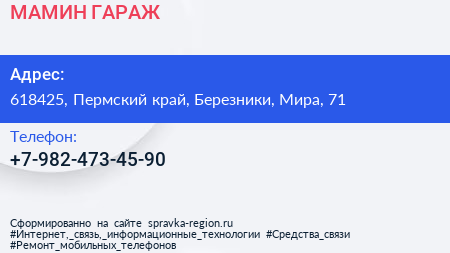 МАМИН ГАРАЖ по адресу 618425, Пермский край, Березники, Мира, 71 в дальнейшем Организация, размещена в следующих категориях: