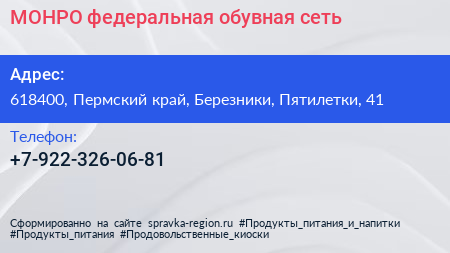 МОНРО, федеральная обувная сеть по адресу 618400, Пермский край, Березники, Пятилетки, 41 в дальнейшем Организация, размещена в следующих категориях: