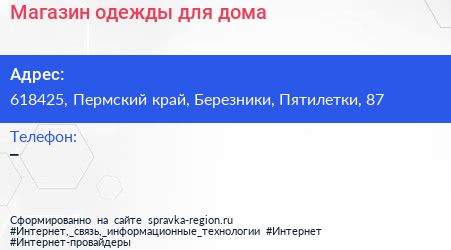 Магазин одежды для дома по адресу 618425, Пермский край, Березники, Пятилетки, 87 в дальнейшем Организация, размещена в следующих категориях: