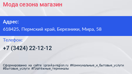 Мода сезона, магазин по адресу 618425, Пермский край, Березники, Мира, 58 в дальнейшем Организация, размещена в следующих категориях: