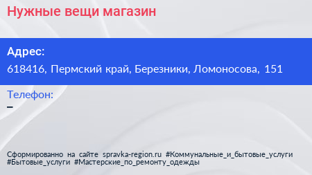 Нужные вещи!, магазин по адресу 618416, Пермский край, Березники, Ломоносова, 151 в дальнейшем Организация, размещена в следующих категориях: