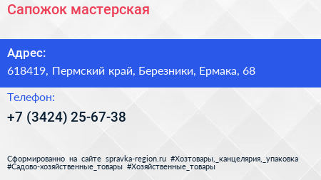 Сапожок, мастерская по адресу 618419, Пермский край, Березники, Ермака, 68 в дальнейшем Организация, размещена в следующих категориях:
