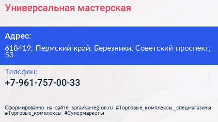 Универсальная мастерская по адресу 618419, Пермский край, Березники, Советский проспект, 53 в дальнейшем Организация, размещена в следующих категориях: