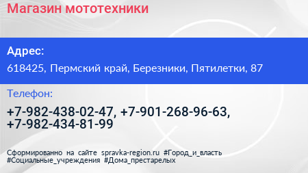 Магазин мототехники по адресу 618425, Пермский край, Березники, Пятилетки, 87 в дальнейшем Организация, размещена в следующих категориях:
