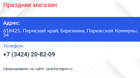 Праздник, магазин по адресу 618425, Пермский край, Березники, Парижской Коммуны, 54 в дальнейшем Организация, размещена в следующих категориях: