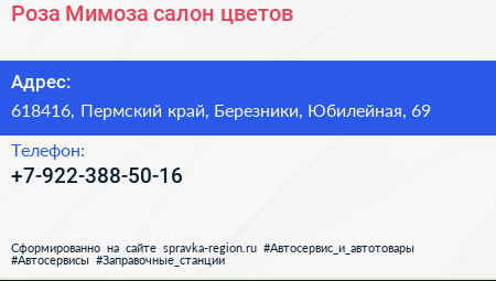 Роза-Мимоза, салон цветов по адресу 618416, Пермский край, Березники, Юбилейная, 69 в дальнейшем Организация, размещена в следующих категориях: