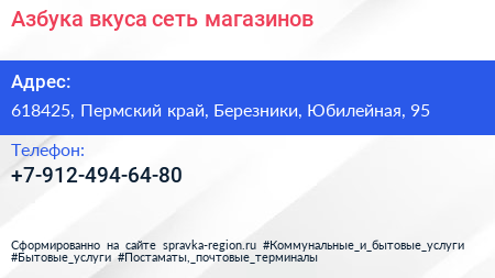 Азбука вкуса, сеть магазинов по адресу 618425, Пермский край, Березники, Юбилейная, 95 в дальнейшем Организация, размещена в следующих категориях: