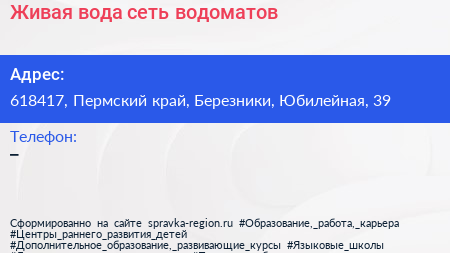 Живая вода, сеть водоматов по адресу 618417, Пермский край, Березники, Юбилейная, 39 в дальнейшем Организация, размещена в следующих категориях: