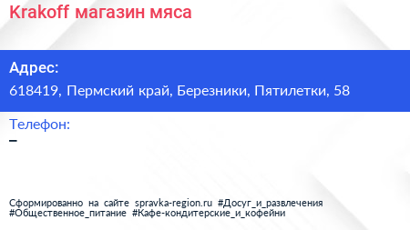 Krakoff, магазин мяса по адресу 618419, Пермский край, Березники, Пятилетки, 58 в дальнейшем Организация, размещена в следующих категориях: