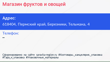 Магазин фруктов и овощей по адресу 618404, Пермский край, Березники, Тельмана, 4 в дальнейшем Организация, размещена в следующих категориях: