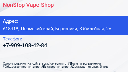 NonStop Vape Shop по адресу 618419, Пермский край, Березники, Юбилейная, 26 в дальнейшем Организация, размещена в следующих категориях: