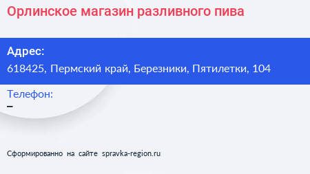 Орлинское, магазин разливного пива по адресу 618425, Пермский край, Березники, Пятилетки, 104 в дальнейшем Организация, размещена в следующих категориях: