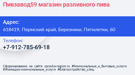 Пивзавод59, магазин разливного пива по адресу 618419, Пермский край, Березники, Пятилетки, 60 в дальнейшем Организация, размещена в следующих категориях: