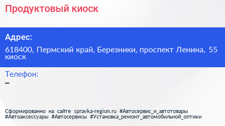 Продуктовый киоск по адресу 618400, Пермский край, Березники, проспект Ленина, 55 киоск в дальнейшем Организация, размещена в следующих категориях: