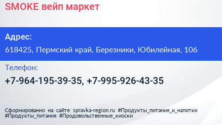 SMOKE, вейп-маркет по адресу 618425, Пермский край, Березники, Юбилейная, 106 в дальнейшем Организация, размещена в следующих категориях: