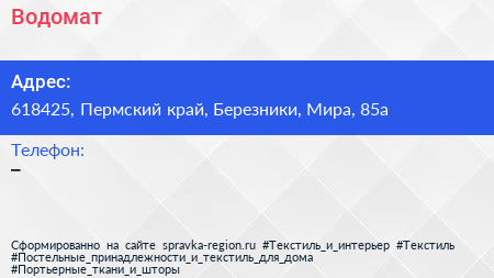 Водомат по адресу 618425, Пермский край, Березники, Мира, 85а в дальнейшем Организация, размещена в следующих категориях: