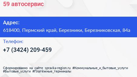 59, автосервис по адресу 618400, Пермский край, Березники, Березниковская, 84а в дальнейшем Организация, размещена в следующих категориях: