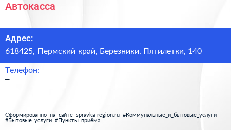 Автокасса по адресу 618425, Пермский край, Березники, Пятилетки, 140 в дальнейшем Организация, размещена в следующих категориях: