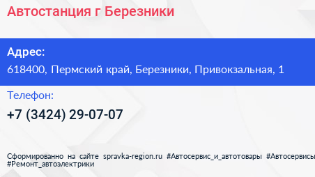 Автостанция, г. Березники по адресу 618400, Пермский край, Березники, Привокзальная, 1 в дальнейшем Организация, размещена в следующих категориях: