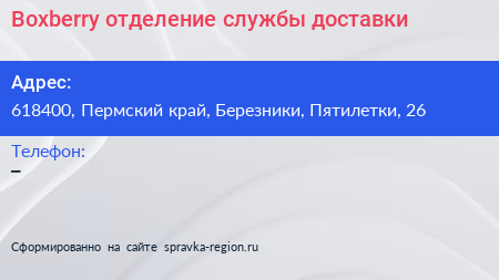 Boxberry, отделение службы доставки по адресу 618400, Пермский край, Березники, Пятилетки, 26 в дальнейшем Организация, размещена в следующих категориях: