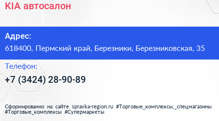KIA, автосалон по адресу 618400, Пермский край, Березники, Березниковская, 35 в дальнейшем Организация, размещена в следующих категориях: