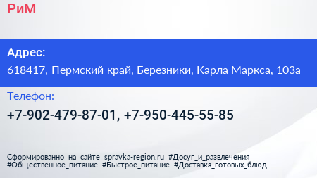 РиМ по адресу 618417, Пермский край, Березники, Карла Маркса, 103а в дальнейшем Организация, размещена в следующих категориях:
